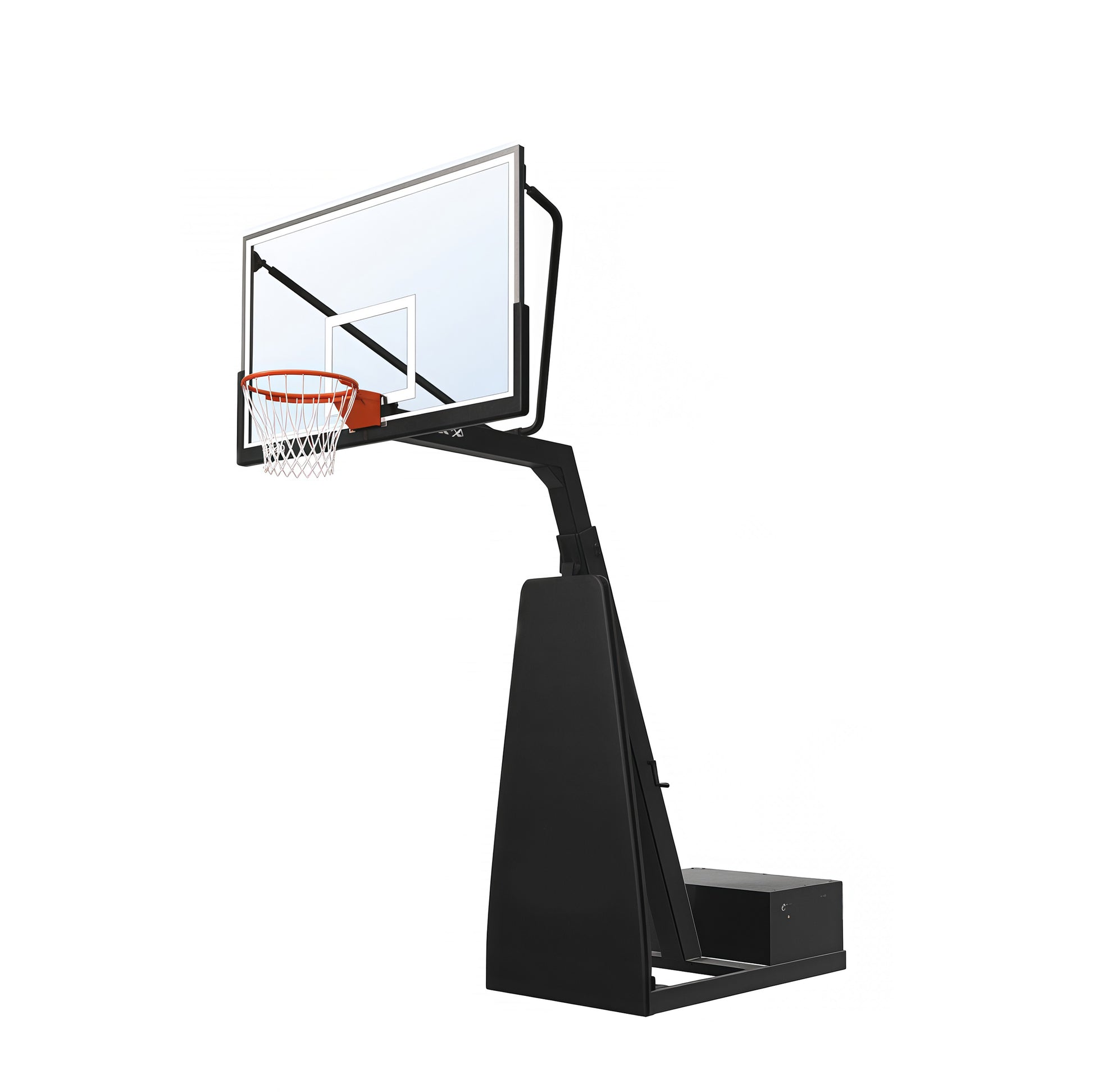 The B100 is a portable basketball hoop, a top choice for gyms, courts, and schools. Equipped with a manual height adjustment system, it's easy to operate. The base is fully padded for player safety and can be branded to meet individual needs. Integrated wheels ensure easy portability and storage. A durable glass backboard and detachable rim combination make it ideal for facilities with limited court space, clubs, and league play.